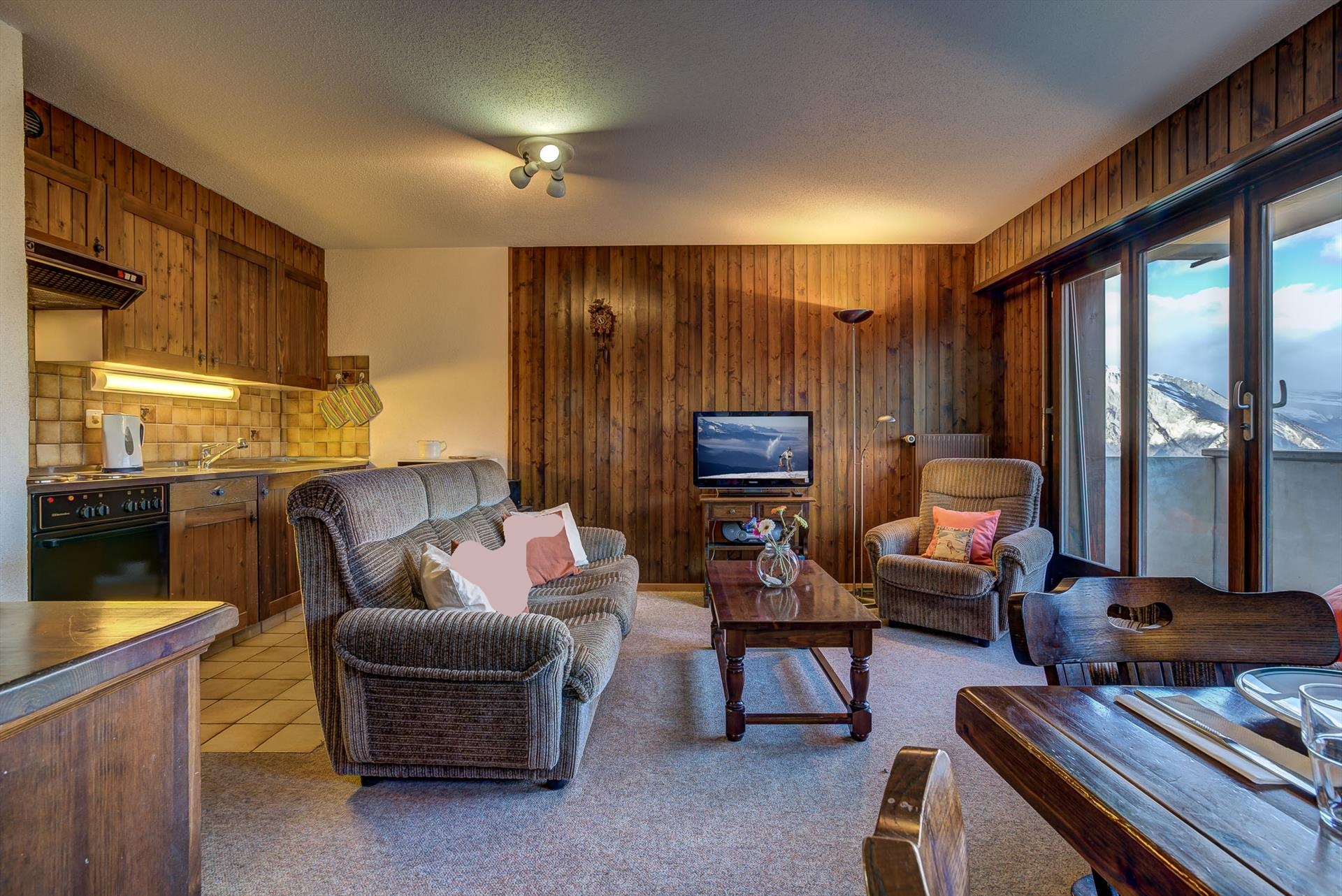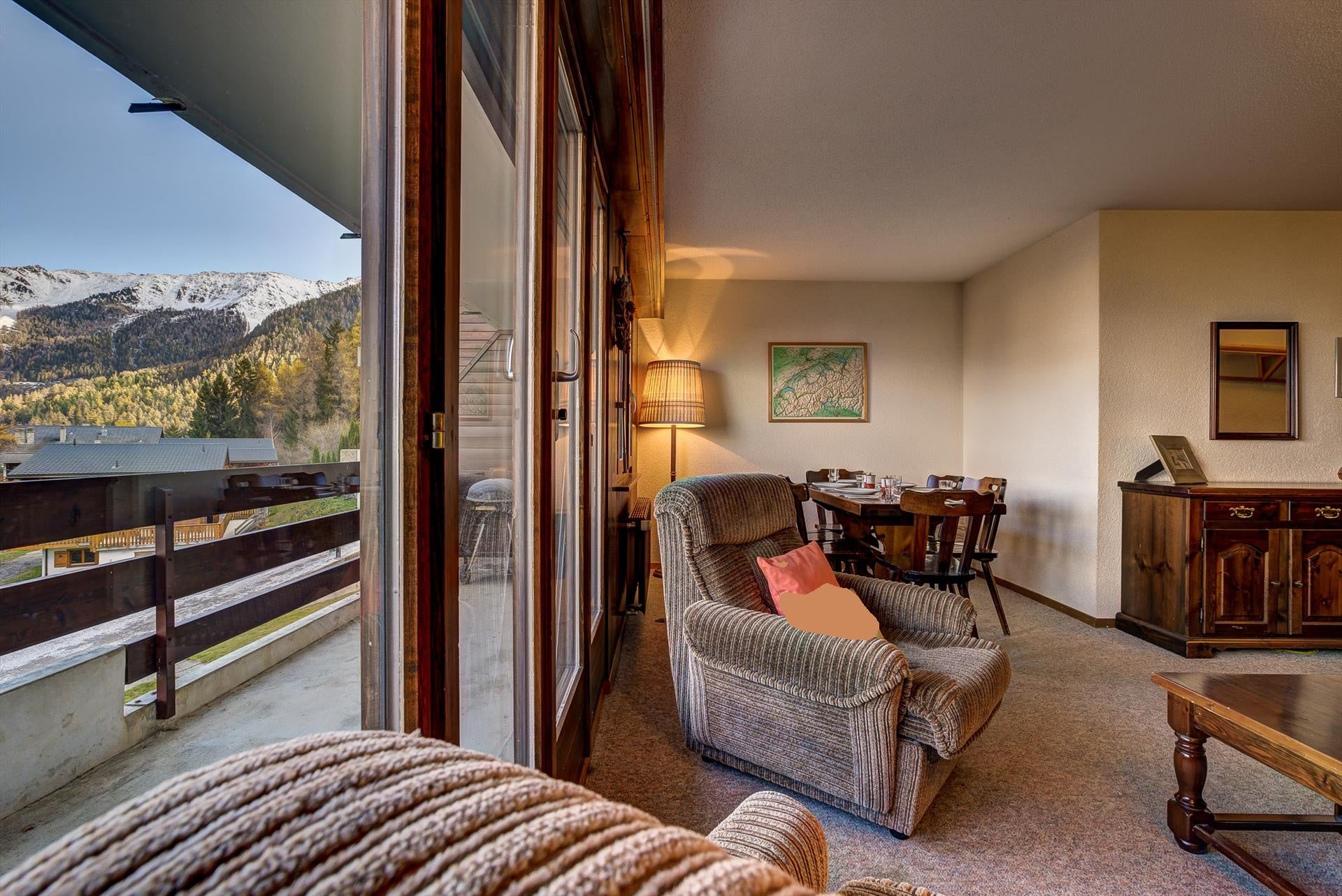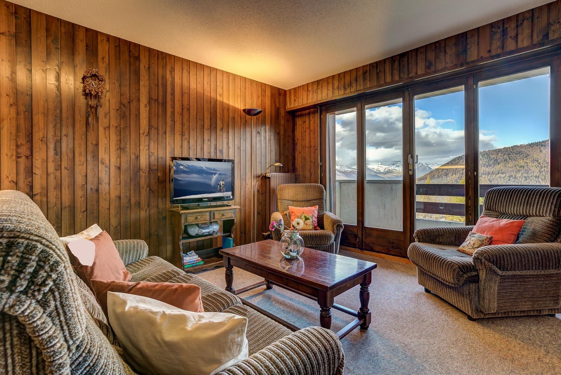 This traversing apartment is perfectly situated only a short walk from the main La Tzoumaz ski-lift and has balconies to the front and rear. The uninterrupted views across the valley are incredible.