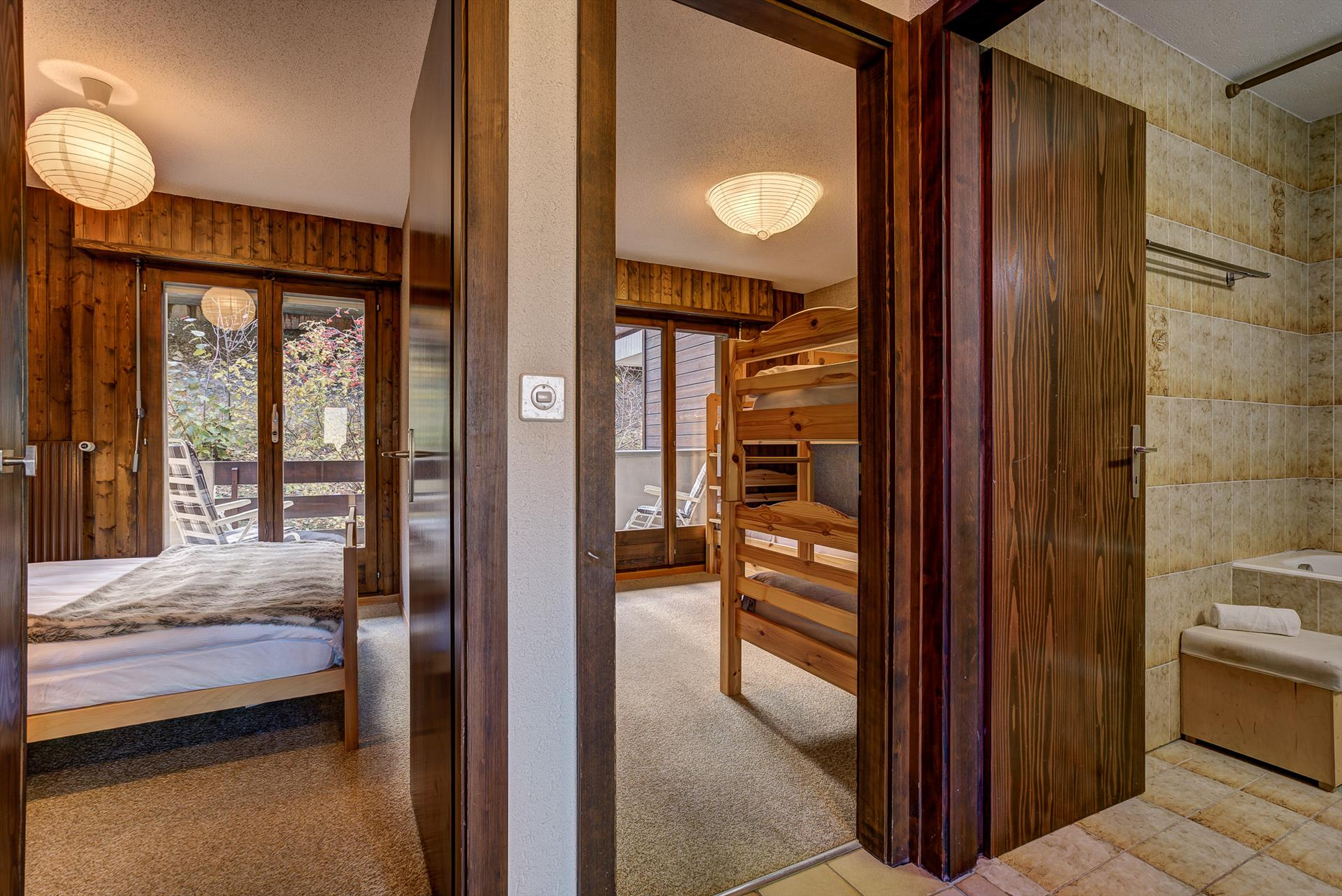 - The second bedroom is fitted with bunk beds for four people, a chest of drawers, and patio doors leading to the rear south-facing balcony with view up towards the road above.