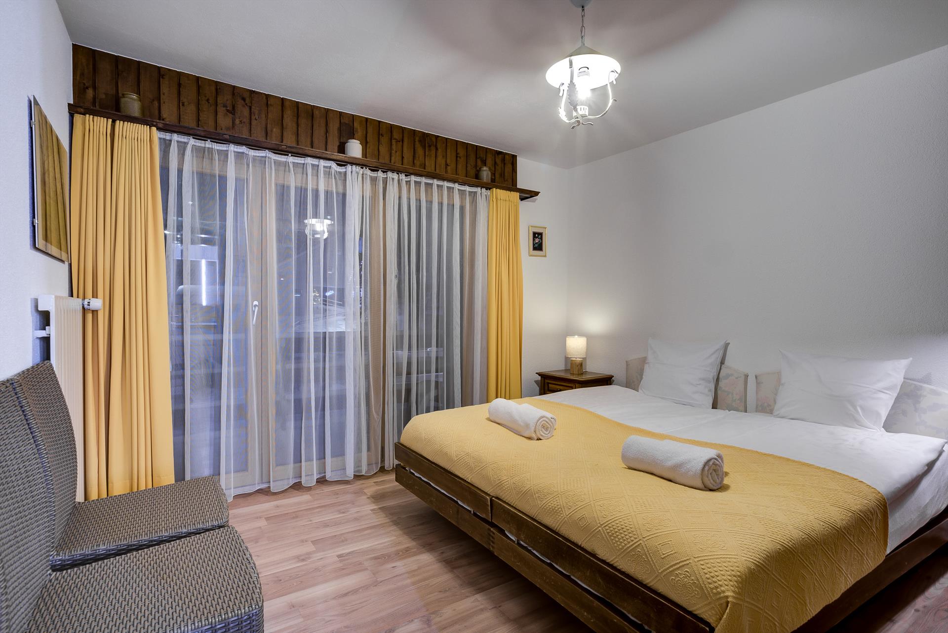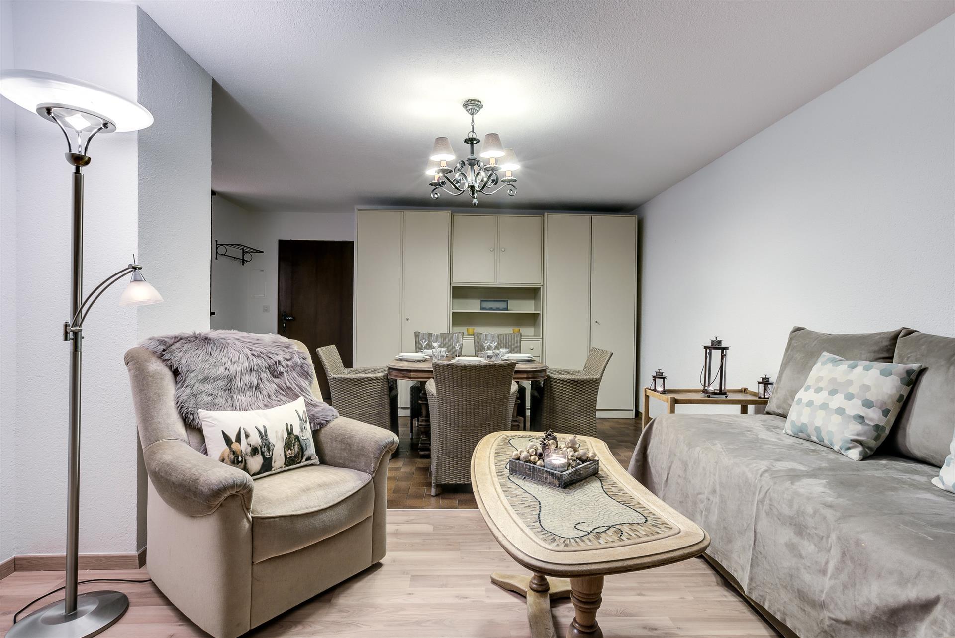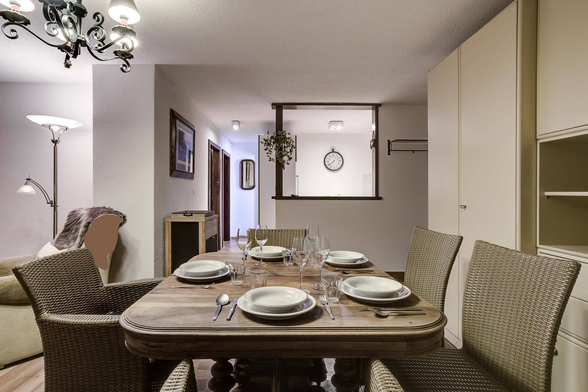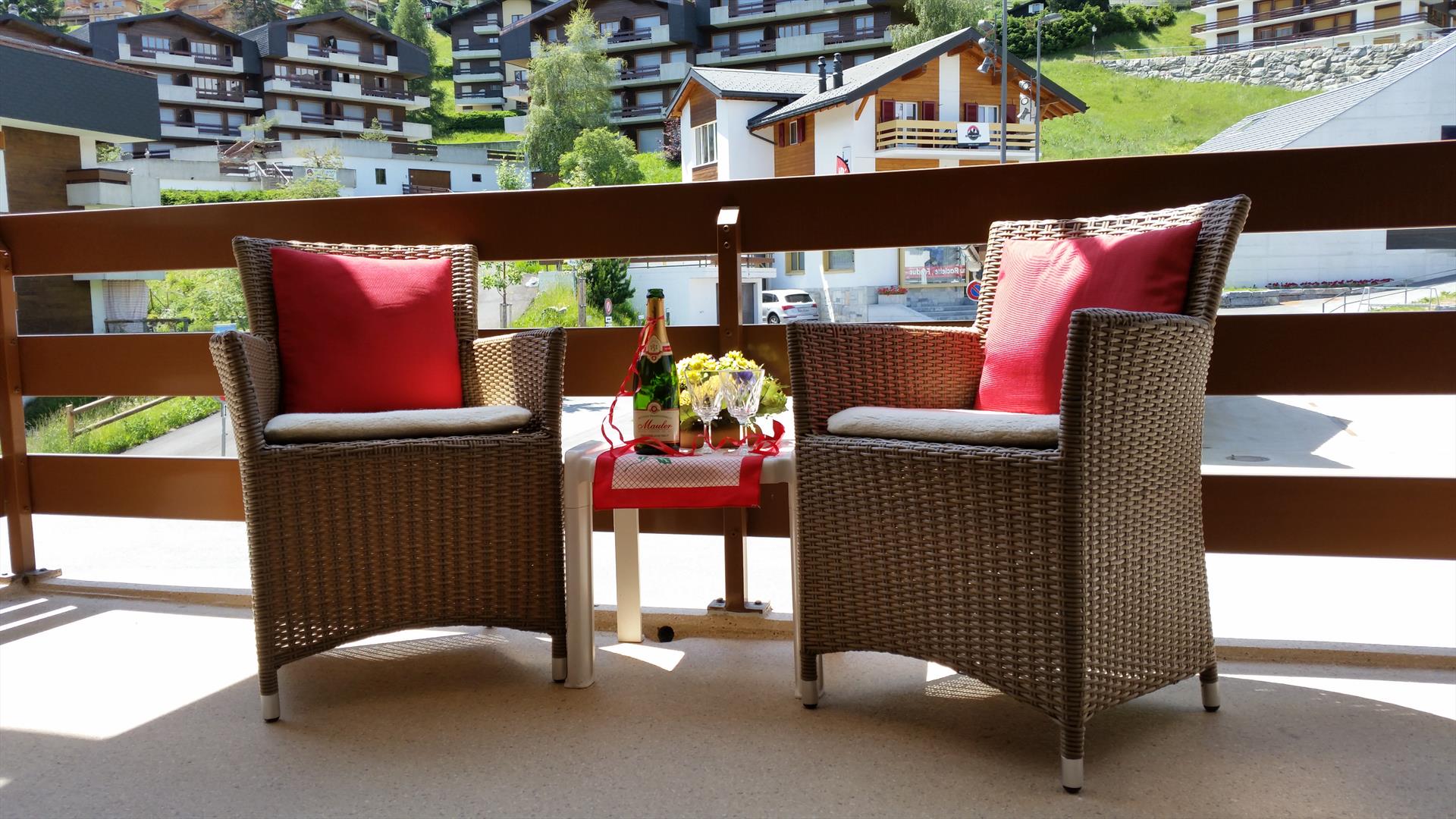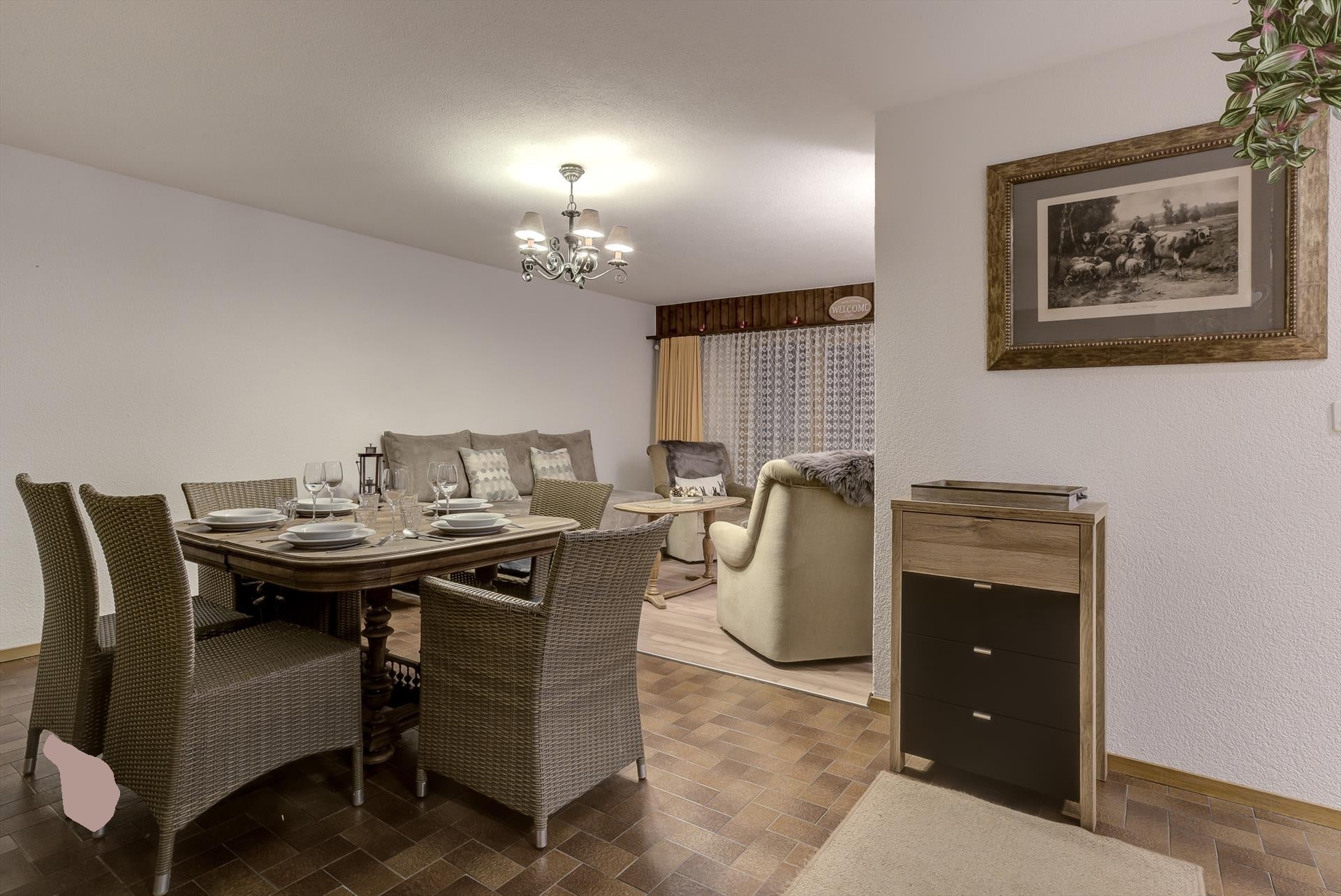 This sunny two-bedroom apartment in a central location overlooks the resort centre. The balcony is south-facing and is a great spot to observe village life and watch the skiers, hikers and telecabins going up the distant piste.