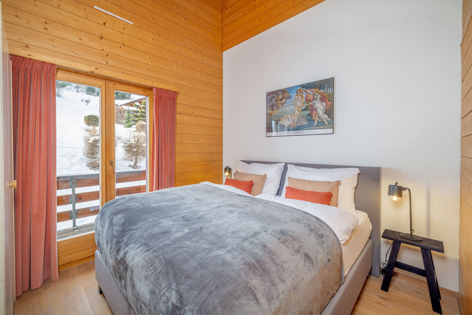 The second floor leads to the master bedroom suite, with en-suite shower room and a further private balcony. The second floor has a further two double bedrooms leading to a balcony, as well as a family bathroom. 6-8 people can comfortably be accommodated here at Chalet M.