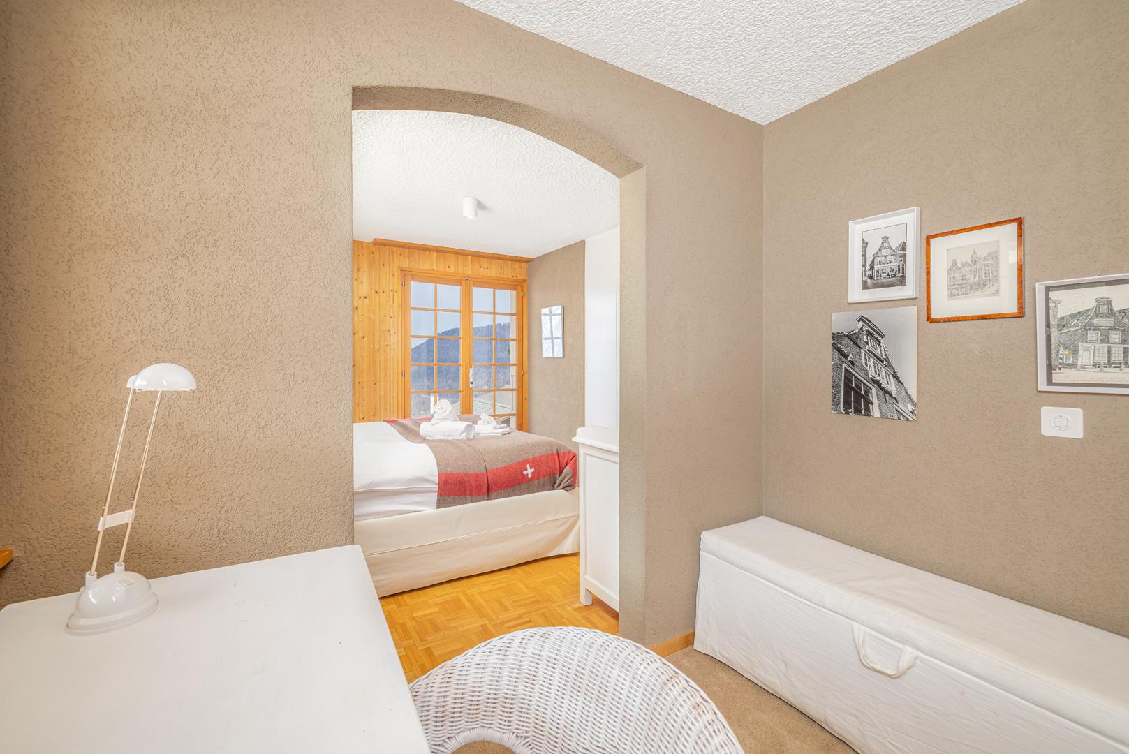 This cozy chalet offers superb panoramic views of the surrounding mountains and forests, making it the ideal destination for a relaxing and rejuvenating getaway. The chalet is built from traditional Swiss wood and stone, giving it a warm and comfortable ambience. It can accommodate up to 9 guests in its 5 comfortable bedrooms, all tastefully decorated and equipped with high-quality furnishings and linens. The chalet's spacious open-plan living room features a fireplace, plush sofas and a dining table for up to 9 people. The chalet has three bathrooms, including two modern shower rooms and a family bathroom with bath and shower. This three-storey chalet also benefits from a pretty garden, an outdoor terrace and a private garage for storing skis, snowboards and mountain bikes.