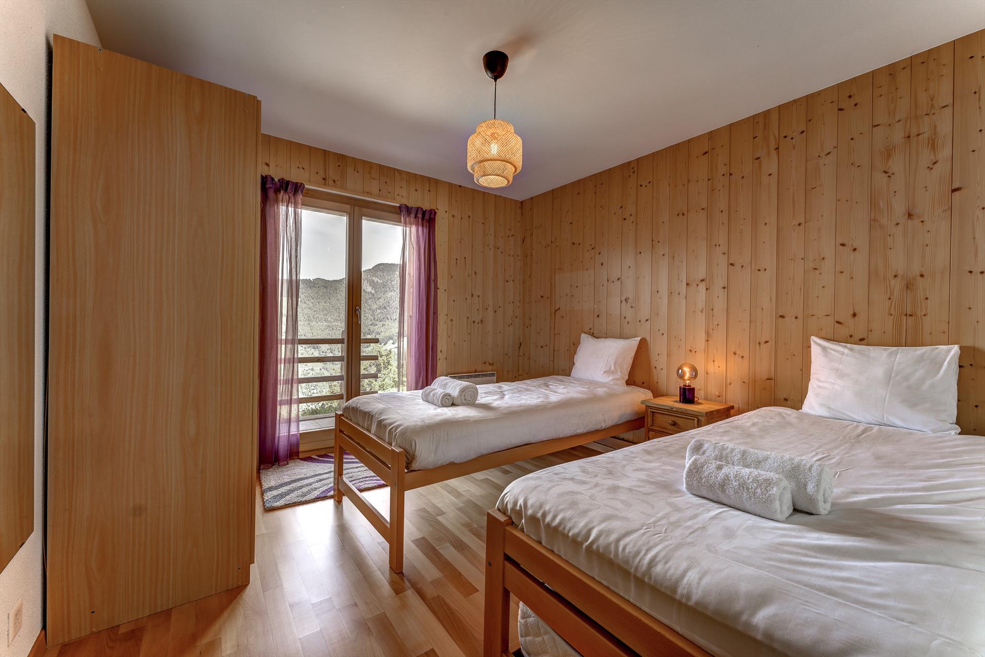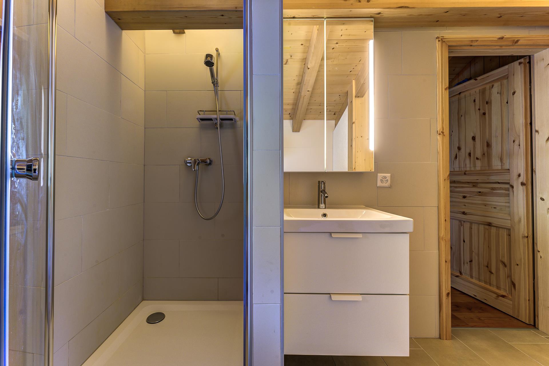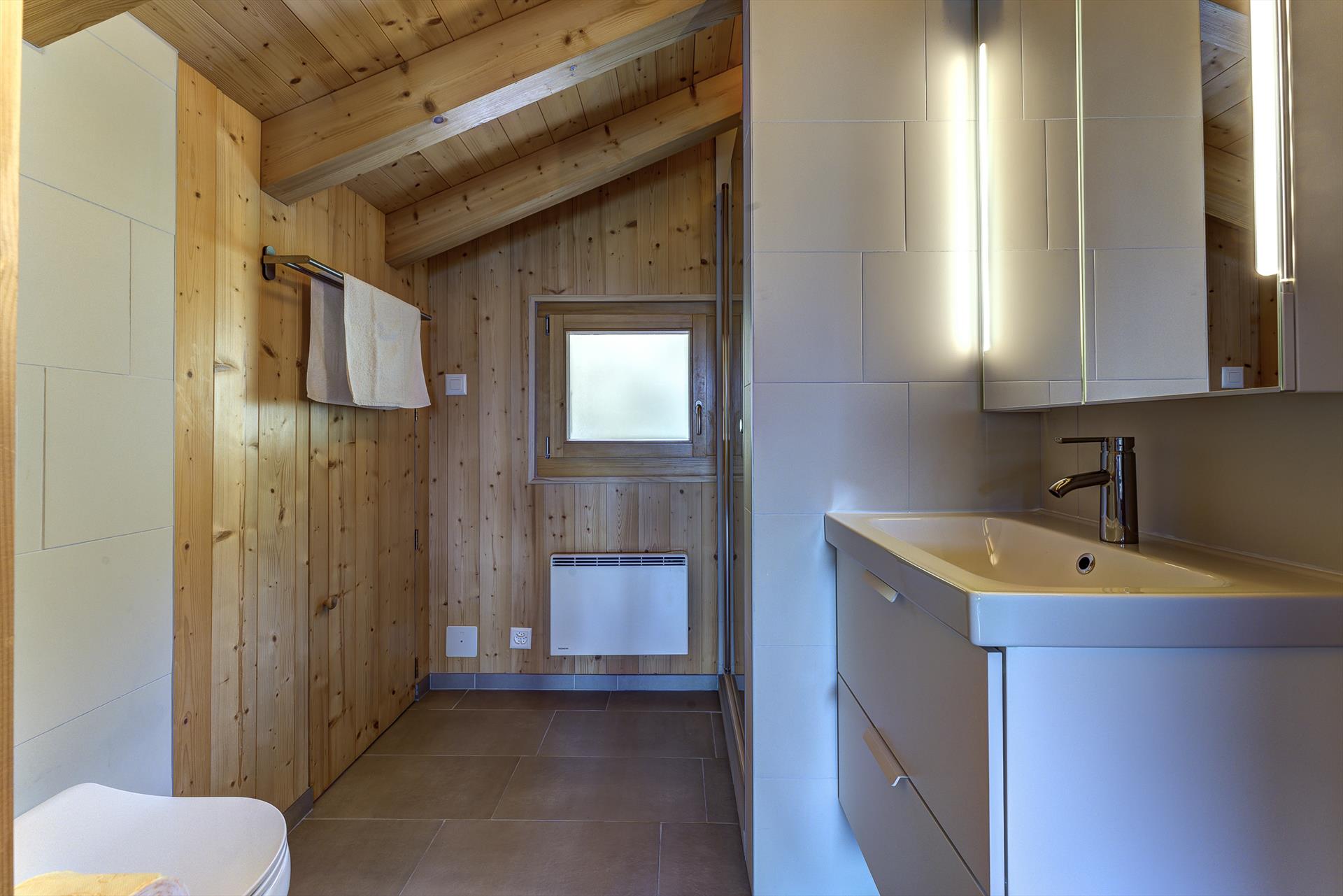 The main floor of this large chalet is an open kitchen/living/dining area with a cosy wood-burning fireplace. The kitchen is fully equipped with everything you might need for family catering, including a dishwasher, microwave, electric filter coffee machine, Nespresso coffee machine, oven, hob and separate freezer. There are fondue and raclette sets for a traditional Swiss evening in front of the log fire. A washing machine, tumble dryer, iron and portable outdoor gas barbecue are all available for you to use. The chalet is equipped throughout with individually-adjustable electric heaters. The chalet has a very soacious ski room with benches in the garage, helping you to keep all your mountain clothing and equipment dry and organised.
